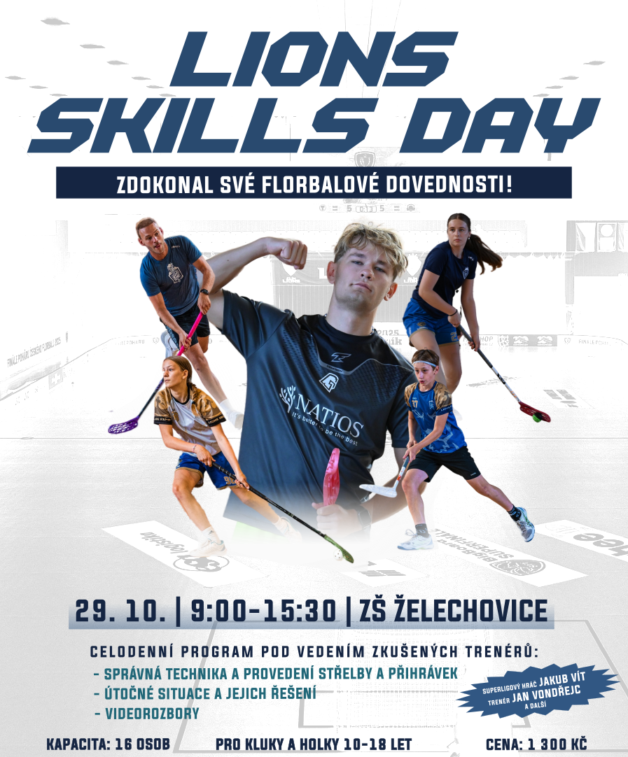 Akce, která tu ještě nebyla. Rozhodli jsme se pro všechny hráče a hráčky uspořádat jednodenní florbalovou akci. Chceš se zlepšit ve svých florbalových dovednostech a posunout svou hru na vyšší úroveň? Pak je LIONS SKILLS DAY právě pro tebe.