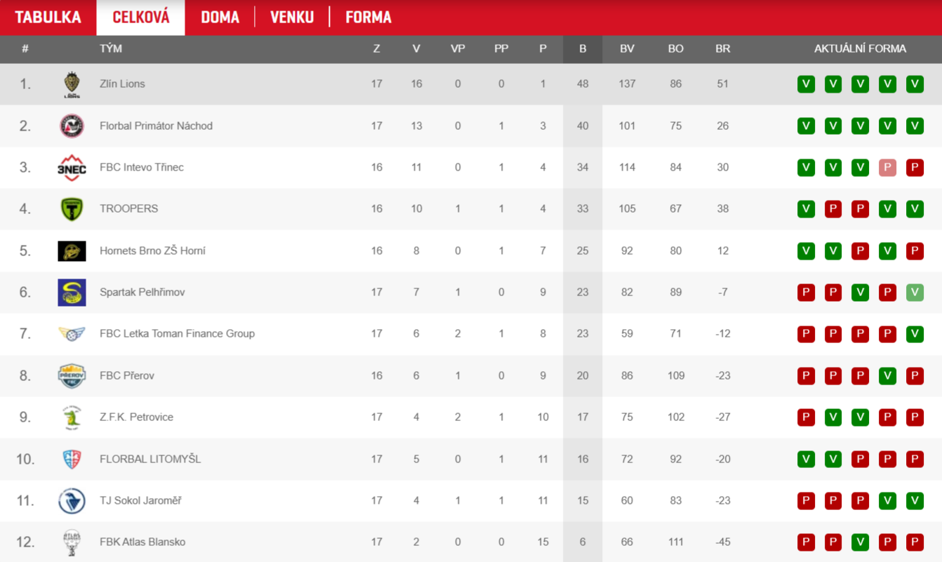 Zlínští Lvi budou vstupovat do utkání se svým sobotním soupeřem z prvního místa, na kterém si stále drží náskok 8 bodů na svého nejbližšího pronásledovatele. Celkem posbírali díky skvělé bilanci 16 výher a pouze jedné prohry již 48 bodů. Poslední venkovní utkání na hřišti Jaroměře Lvi zvládli a aktuálně drží sérii již třinácti vítězných zápasů v řadě. Postavení v tabulce se pak odráží i ve statistice vstřelených branek. Lvi jsou jednoznačně nejofenzivnějším celkem. Do sítě soupeřů se trefili již 137x. Co se týká defenzivy, tam patří mužům s 86 inkasovanými v porovnání s ostatními týmy sedmá příčka.