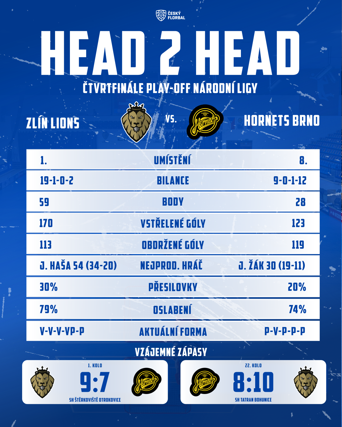 Základní část minulostí. V sobotu a v neděli odstartují čtvrtfinálové boje. Třetí sezona Lvů v Národní lize byla po základní části vůbec tou nejúspěšnější. Po loňském 4. místě tentokrát základní část vyhráli a do vyřazovací části tak vstupují z nejlepší možné výchozí pozice. Při výběru soupeřů měli Lvi možnost zvolit jako první svého čtvrtfinálového soupeře. A volba padla na brněnské Hornety. V tomto směru tak dochází ke změně, když se v loňském i předloňském čtvrtfinále utkali muži se šumperským Asperem. Z druhého místa si následně vybrali náchodští Pelhřimov, třetí Třinec ukázal na Litomyšl a na čtvrté Troopers zbyli florbalisté Přerova.