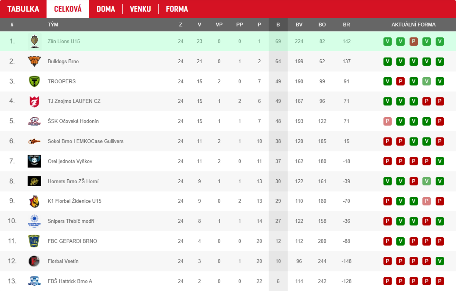 Starší žáci zažívají úspěšnou sezonu. Základní částí ligy starších žáků se prohnali ve velkém stylu. Díky fantastické bilanci 23 vítězství z 24 utkání ji jasně ovládli. A dlouho to navíc vypadalo, že jí projdou zcela bez porážky. Tři kola před koncem jim ale dokázali přerušit jejich stoprocentní bilanci brněnští Buldoci. Ti se umístili za mladými Lvy na druhém místě a společně s Troopers a Znojmem se utkají o celkové vítězství na turnaji Final Four ve Zlíně.